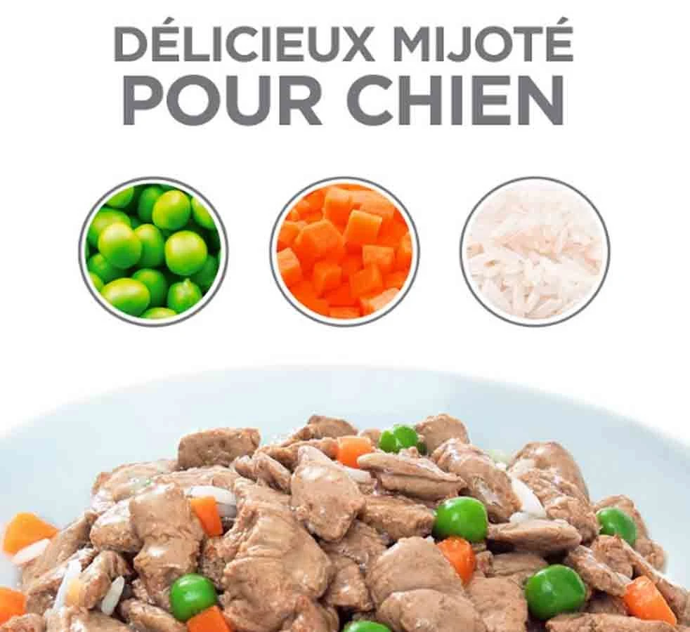 Ces succulents Mijotés dans leur nouveau sachet repas contiennent des éléments nutritifs essentiels qui favorisent la bonne santé et le bien-être de votre chien. Les délicieux Mijotés boeuf et poulet peuvent être servis seuls, mélangés aux croquettes, ou simplement en accompagnement pour ajouter de la gourmandise et de la variété aux repas.